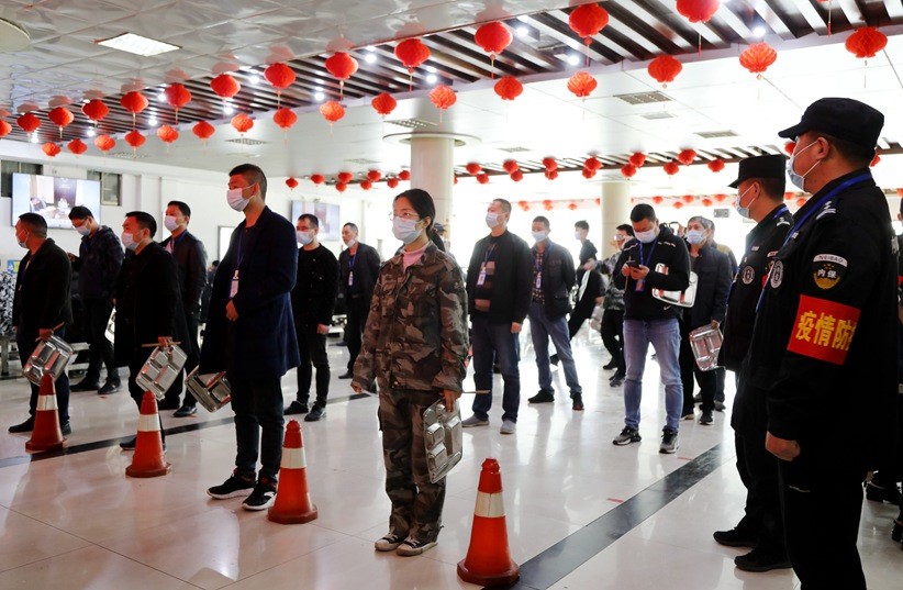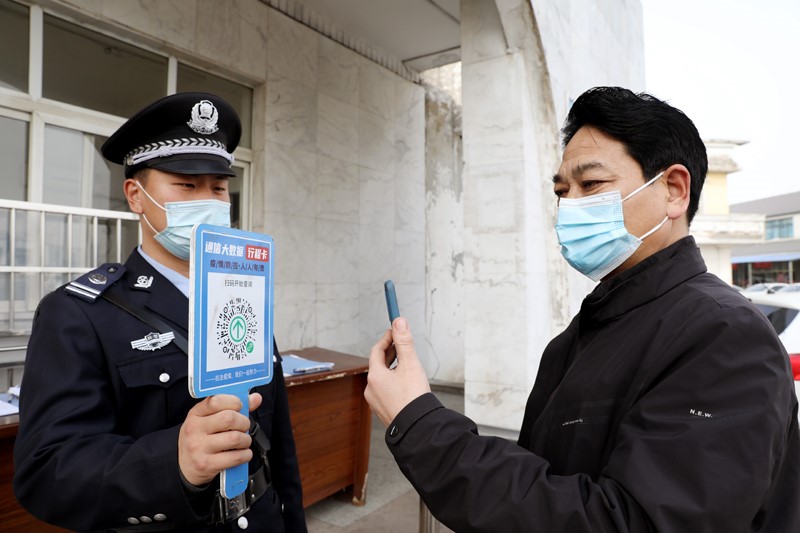 3月15日中午,在钱营孜矿工广,该矿疫情防控巡查人员正对前往食堂吃午饭员工的口罩佩戴情况进行督查。
