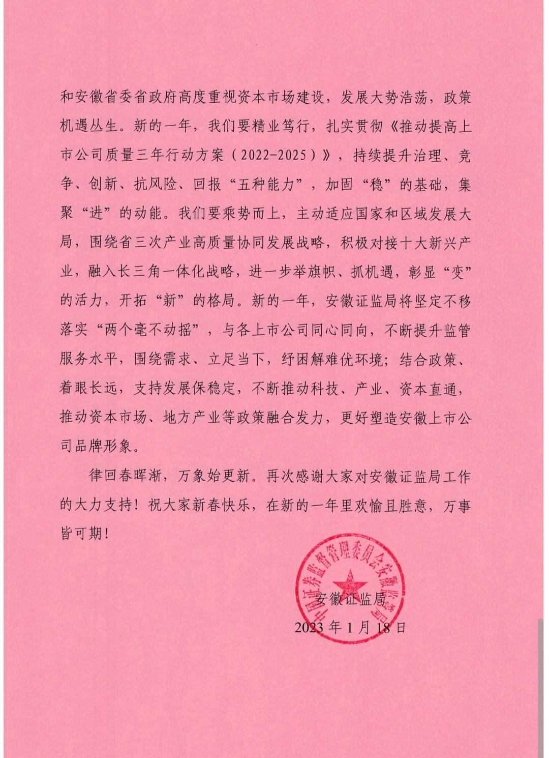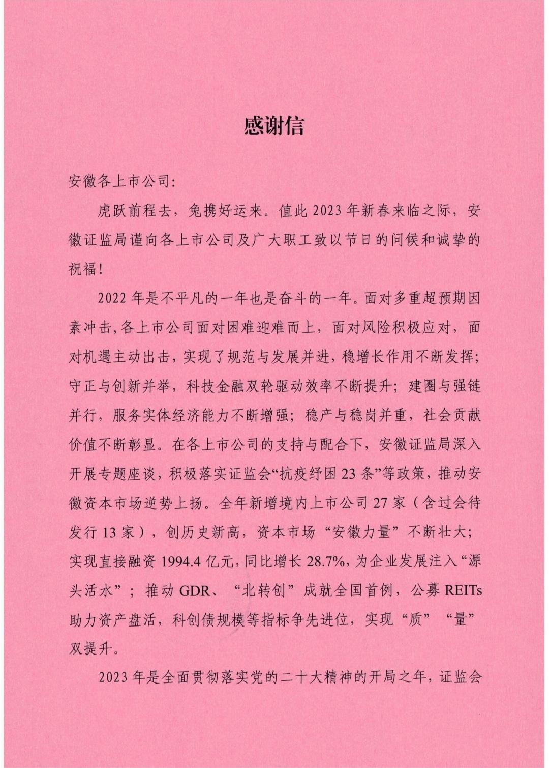 《感谢信》来自安徽证监局。“在2023年新春来临之际,乐鱼leyu向辖区各上市公司寄送《感谢信》,送去节日的问候和祝福。”安徽证监局有关负责人表示,2022年是不平凡的一年也是奋斗的一年。面对多重超预期因素冲击,各上市公司面对困难迎难而上,面对风险积极应对,面对机遇主动出击,实现了规范与发展并进,稳增长作用不断发挥;守正与创新并举,科技金融双轮驱动效率不断提升;建圈与强链并行,服务实体经济能力不断增强;稳产与稳岗并重,社会贡献价值不断彰显。