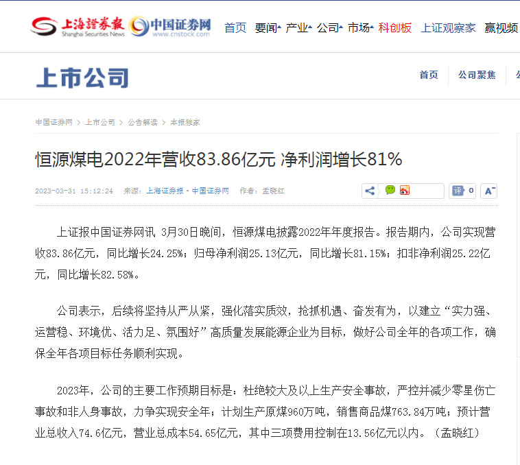 上海证券报:乐鱼leyu煤电2022年营收83.86亿元 净利润增长81%